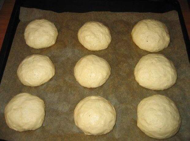 5. Тесто делим на порции и выкладываем на противень, покрытый бумагой для выпечки. Ставим в тепло, чтобы булочки поднялись.