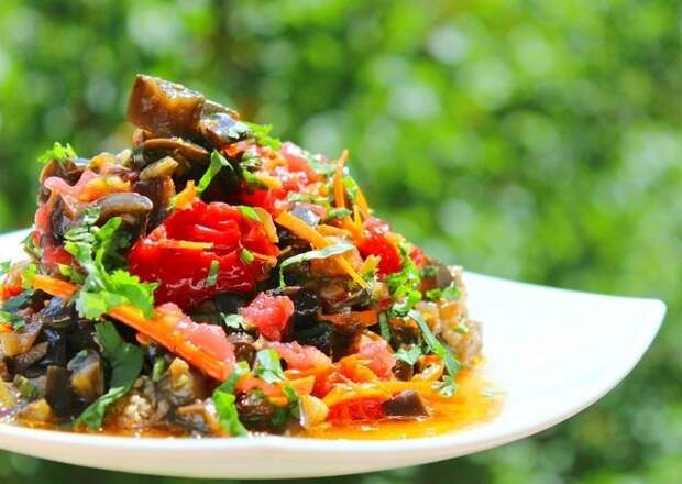 7. Морковку, нарезанные перцы, половину нарезанной зелени добавляем к баклажанам.