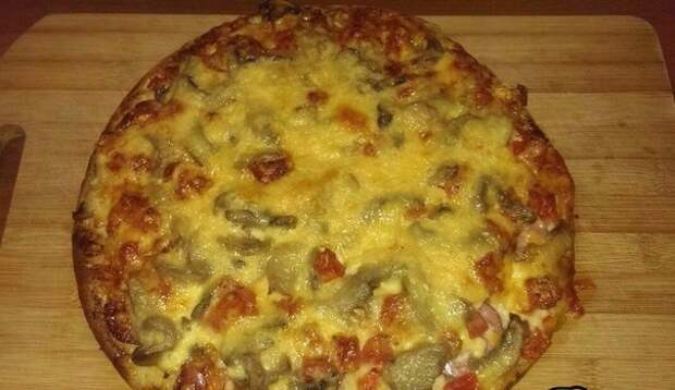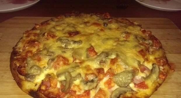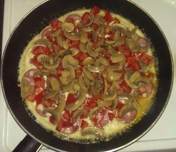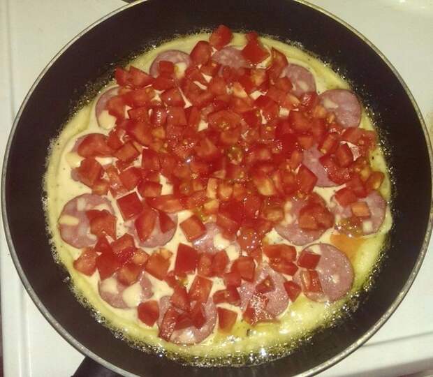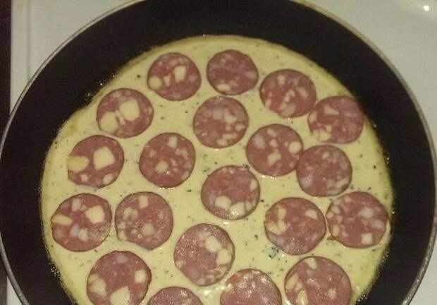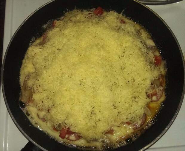 - Тесто заливаем в сковороду, сверху располагаем начинку, посыпаем тертым сыром.