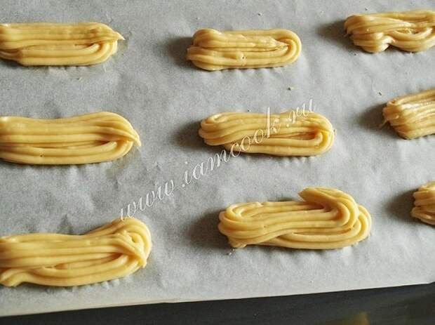 Тесто выкладываем в кондитерский мешок, застилаем противень бумагой для выпечки и выдавливаем тесто полосками. Ставим выпекаться в разогретую до 200 градусов духовку, печём 10 минут.