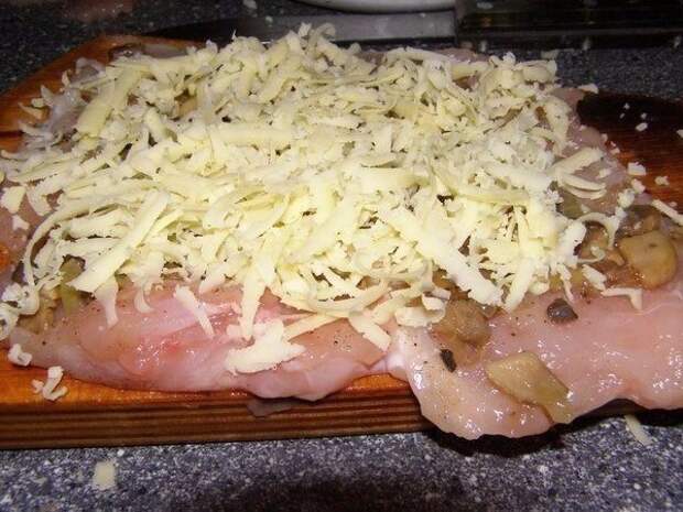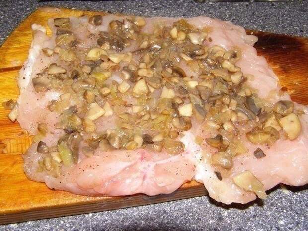 Грудки отбить, посолить и поперчить. Грибы и лук мелко порезать, обжарить на сковородке, слегка подсолив и поперчив.