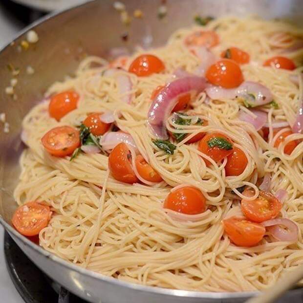 4. Отварите пасту в подсоленной воде до состояния аль денте. Слейте воду и выложите пасту к соусу. Добавьте к ней сыр и нарезанный базилик. Хорошо перемешайте и подавайте.