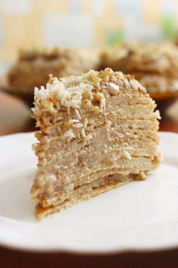 8. Достаем из холодильник крем, промазываем блины. Украшаем торт на свой вкус.