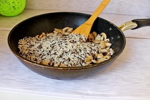 2. Добавить рис, перемешать и готовить 1 минуту, чтобы рис пропитался маслом.