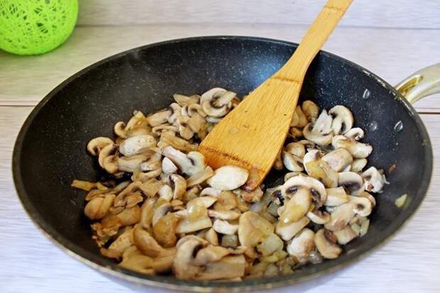 1. Лук нарезать кубиками, грибы — пластинами. Обжарить лук и грибы на растительном масле до мягкости грибов.