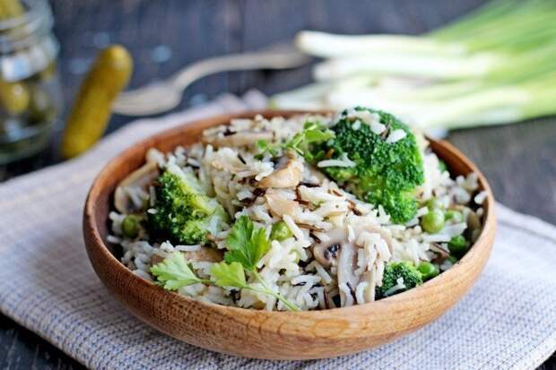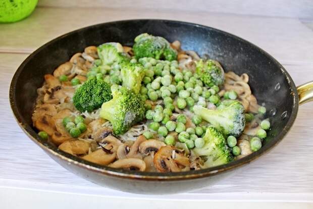 3. Добавить зеленый горошек и брокколи, приправить по вкусу и довести до готовности риса, около 5 минут.