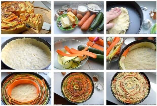 Теперь ставим нашу форму с «корзинкой» из теста в холодильник и занимаемся начинкой. Морковь чистим, цуккини режем прямо с кожурой. В этом пироге важно, чтобы полоски овощей были примерно одной ширины. Поэтому подравниваем овощи по толщине при помощи ножа, а затем нарезаем тоненькими полосками при помощи овощечистки.