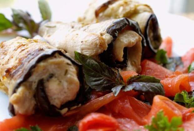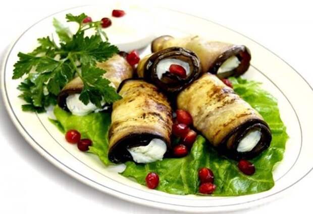 3. На каждую пластину баклажана выложить по одной неполной чайной ложке начинки и свернуть ее в рулетик. Готовые рулетики выложить на блюдо и украсить зеленью.