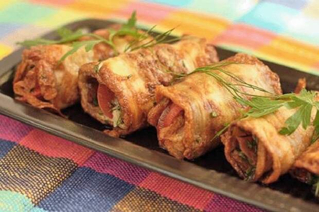 2. Чеснок нарезать как можно мельче, смешать с укропом и немного посолить. Баклажаны обсушить, обмакнуть в яйцо. Обжарить с двух сторон до золотисто-коричневого оттенка. На каждый ломтик баклажана положить кусочек помидора,чайную ложку укропа с чесноком и завернуть в рулетик. Готовые рулетики накрыть пищевой пленкой и дать полежать в холодильнике минимум час.