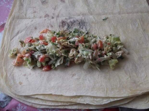 Выкладываем на край овощи, сначала складываем конвертиком, а потом скручиваем в рулетики.