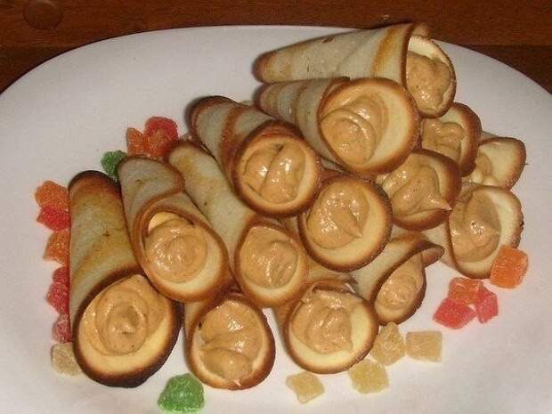 Выпекать в разогр. духовке. Аккуратно снять лопаткой, пока горячая закрутить трубочку.