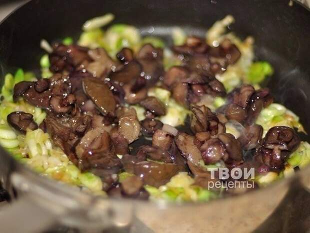 Лук-порей нарежьте тонкими ломтиками. Крупные грибы нарежьте кусочками (в данном случае используются маслята, предварительно отваренные).