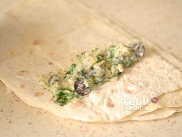 Снимите с огня. Посолите и поперчите по вкусу. Если листы лаваша большие, разрежьте их пополам. На каждый лист положите 1/8 начинки и сверните ролл.